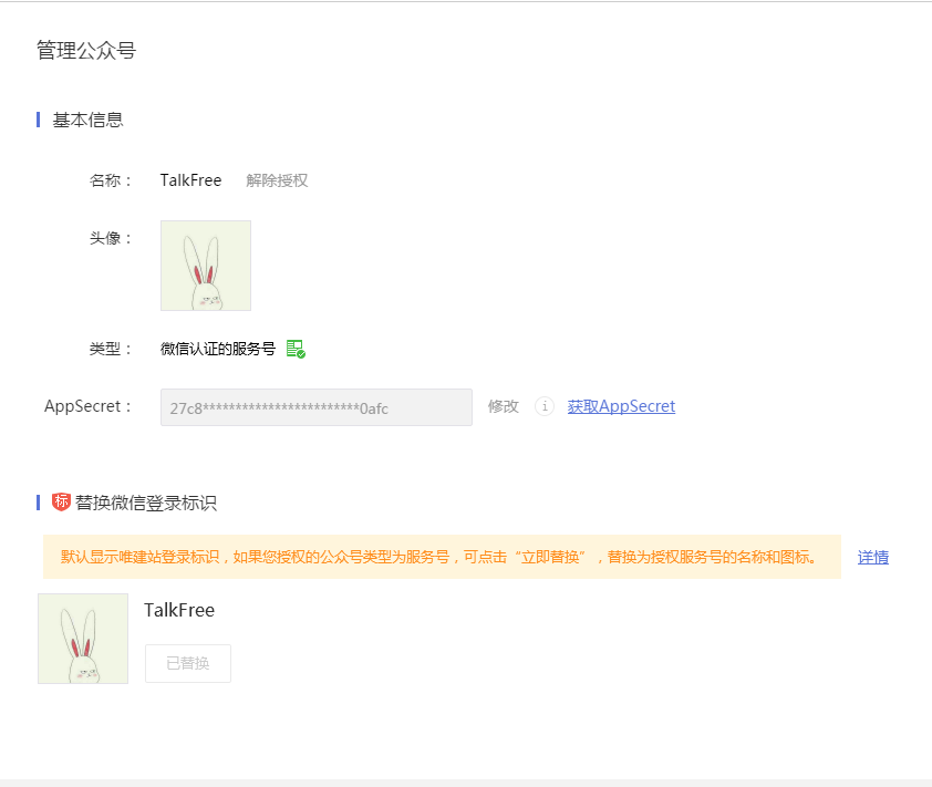 6. 授权成功后,若替换为自己服务号的"立即替换"按钮显示为灰色,说明您绑定的公众号不是已认证服务号,所以无法替换名称。您需要解除授权重新绑定认证的服务号。