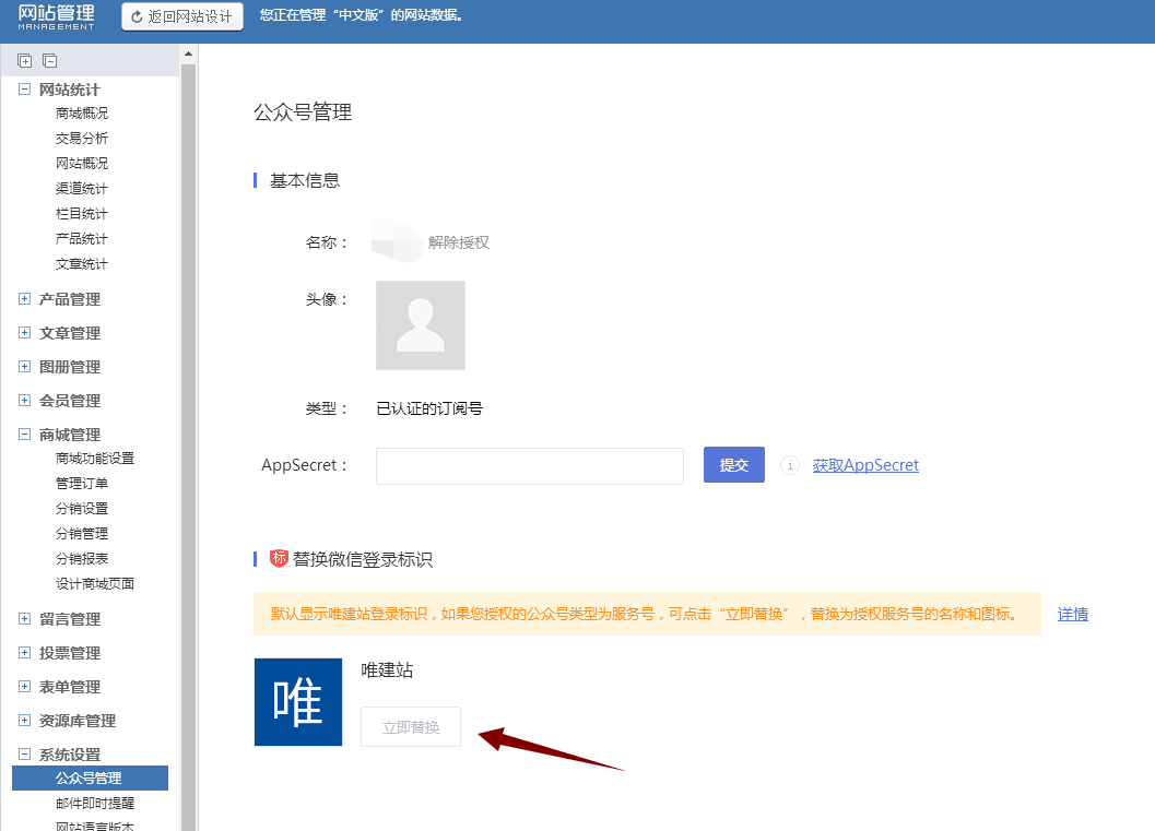 5、授权成功后,若替换为自己服务号的"立即替换"按钮显示为绿色,点击后便可以将“唯建站”的登录标识替换为您自己服务号的名称。