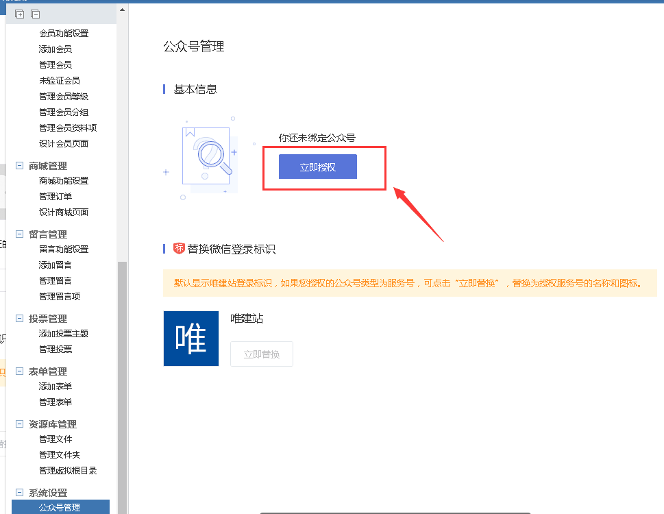 1、进入:网站管理-公众号管理,点击"立即授权",将已认证服务号授权到网站平台;