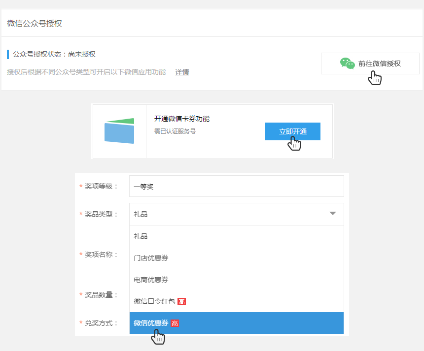 先到管理平台【个人中心】中进行服务授权,授权后已认证服务号即可选用“微信优惠券”奖品类型