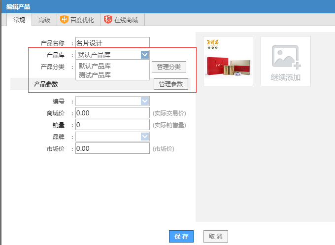 2、设置好不同产品库的参数、购物选项后,这时,您在添加产品时就可以使用了