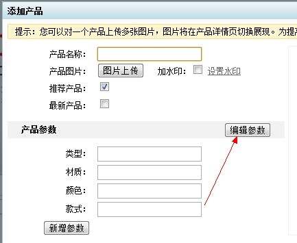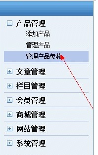 在打开的网站管理界面,点击“管理产品参数”按钮,如图所示: