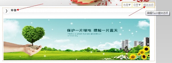 2、找到您网站页面上的Flash模块,如图所示,“环保”模块是一个Flash模块,点击右上角的“模块选项”按钮进行编辑: