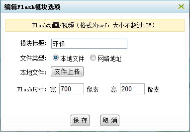 如果文件类型选择为本地文件,但是未上传新文件,则表示不更改Flash文件,只对模块标题和Flash尺寸进行修改。