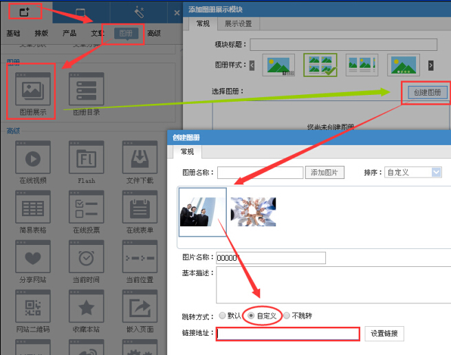 常用模块(图文展示模块,图文链接模块,图册展示模块等)下面介绍一下 图文展示模块与图册展示模块的图片超链接设置方法。