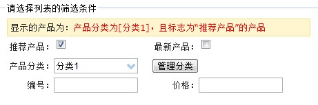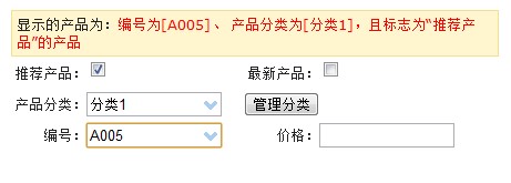 示例1,展示分类是“分类1”且标志为“推荐产品”的产品: