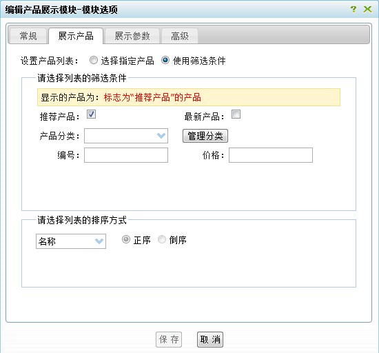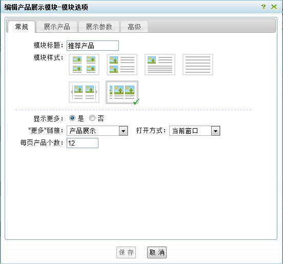包括四个部分:常规、展示产品、展示参数和高级