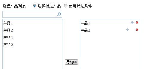 在左侧的框中,点击需要展示的产品(可多选),点“添加”按钮,就可以添加到产品展示框中,如果产品数量太多,可以使用上方的搜索。