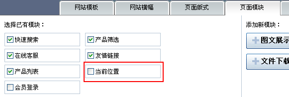 勾选“当前位置”模块(注:首页没有该模块的选项,因为首页不需要当前位置导航),勾选后,页面上出现该模块:
