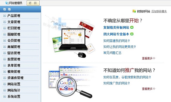如图所示,网站管理功能包括对产品、新闻、栏目、图册、会员、商城、留言、投票、表单、模块、资源库(空间)、网站设置、系统设置等进行管理。