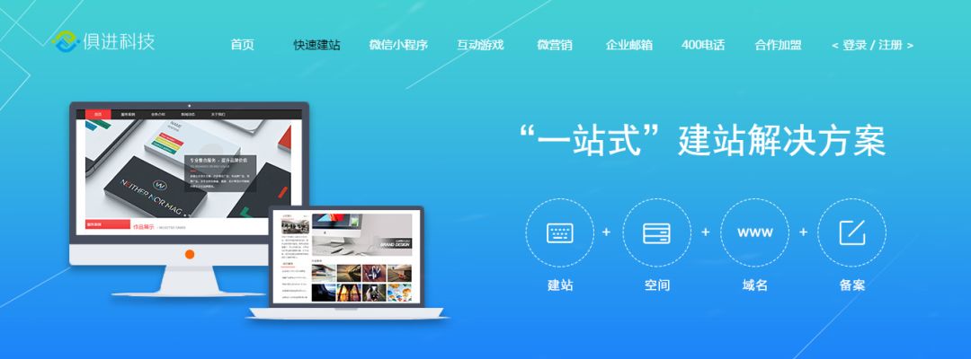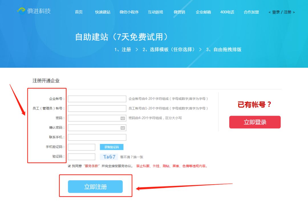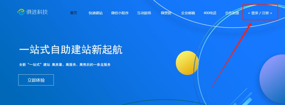 搜索俱进科技,进入官网之后点击上边的“快速建站”,跳转网页后选择右上角的〈登陆/注册〉,在注册界面输入所需相关信息后点击注册。