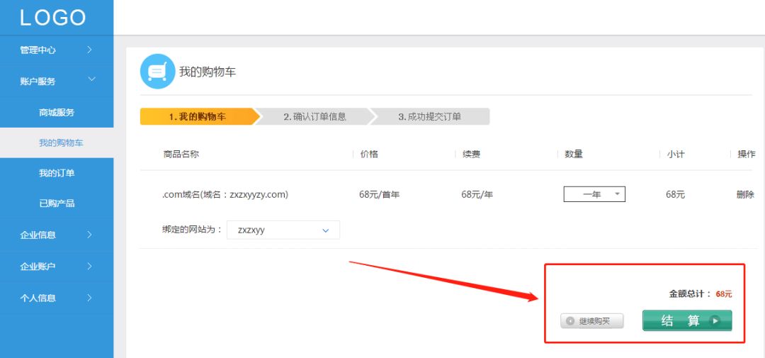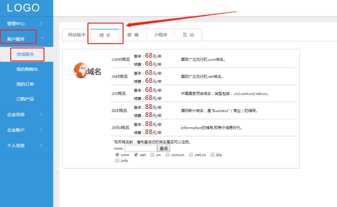 登陆俱进企业中心管理后台之后,进入“账户服务”——“商城服务”——“域名”