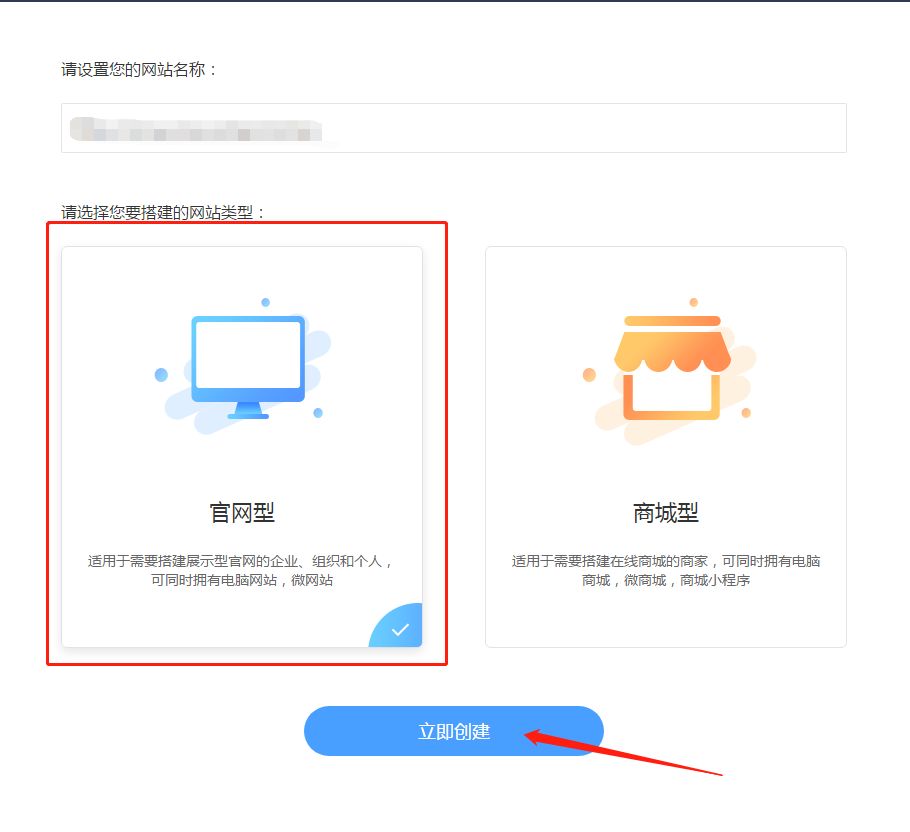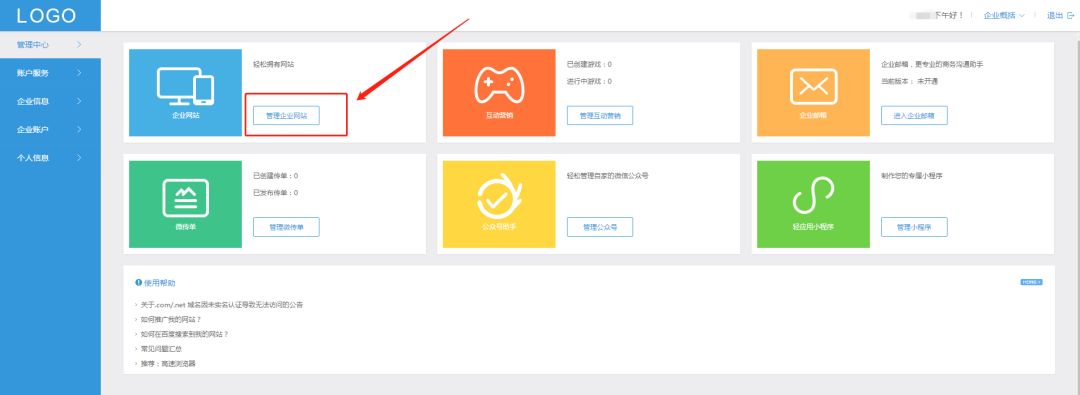 返回“企业中心”,点击“管理企业网站”,输入自己的网站名称后,选择“官网型”后点击“立即创建”。