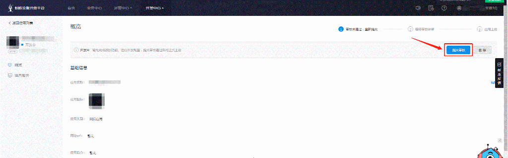 -如何将应用提交审核:进入应用详情页面后,点击“提交审核”按钮。审核通过后的应用显示“已上线”状态。(如下图)