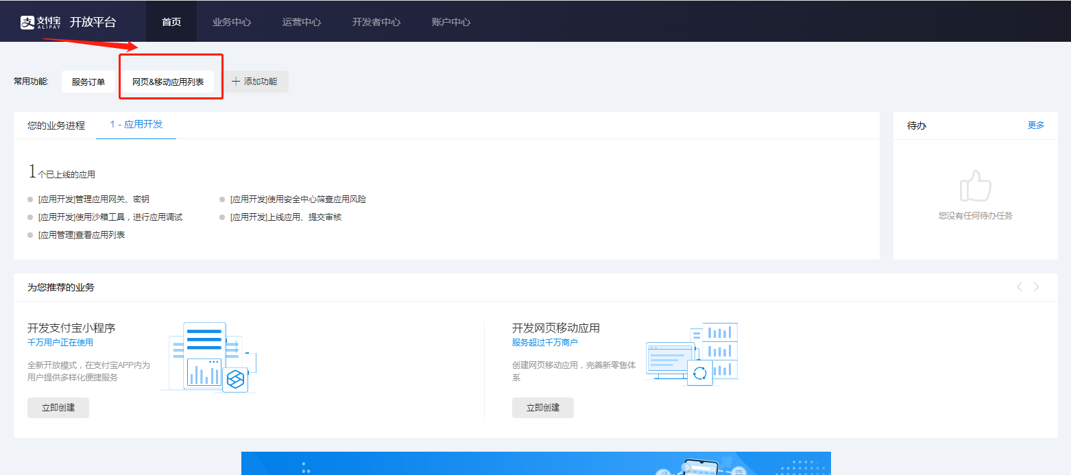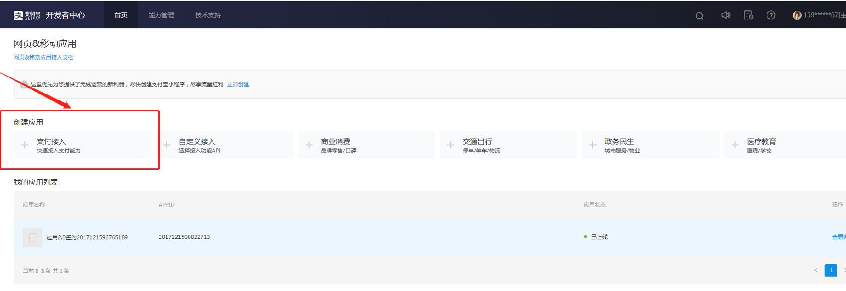 随后进入到开发平台的首页,依次点击“网页&移动应用列表-支付接入”创建新应用。