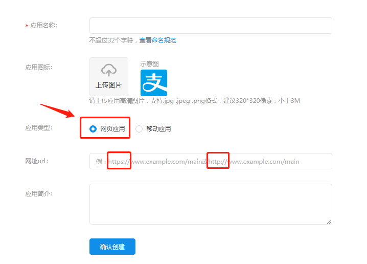 如果想要填写,可输入已备案的一级域名,域名开头需带上http或https,否则无法创建应用,如下图示例。