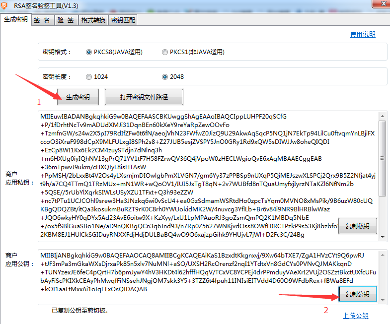 1.3.5、运行后,弹出如下窗口,根据开发语言选择密钥格式(一般是默认Java),选择密钥长度(2048位),点击“生成密钥”,会自动生成商户应用公钥和商户应用私钥,可直接“复制公钥”到步骤1.3.2的窗口填写。