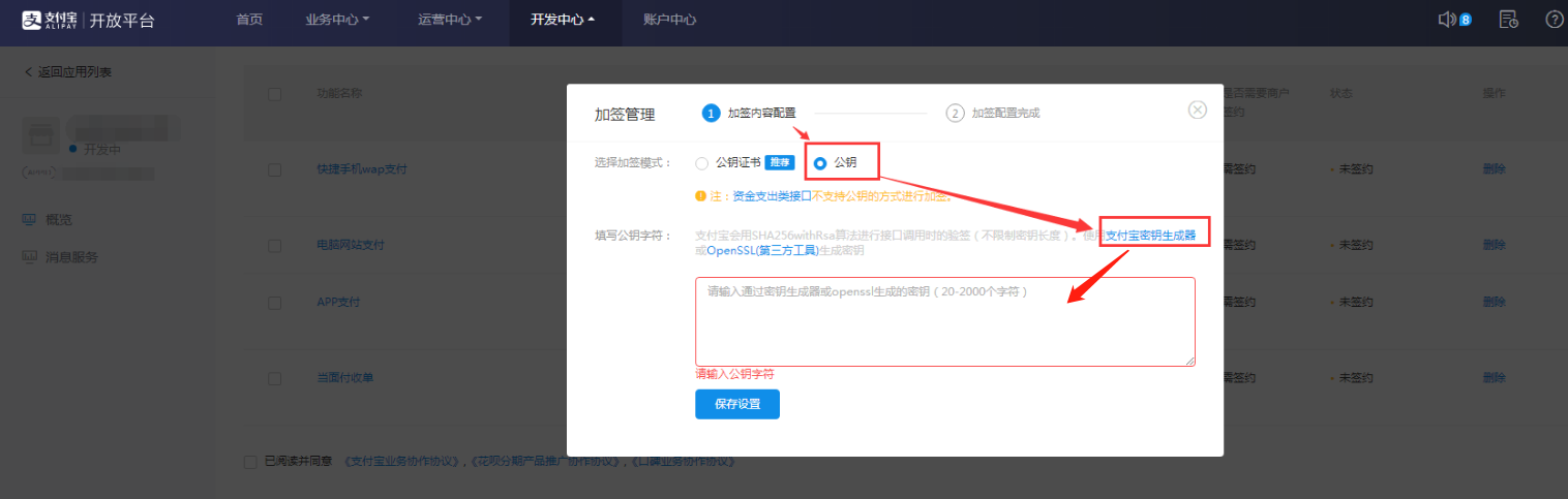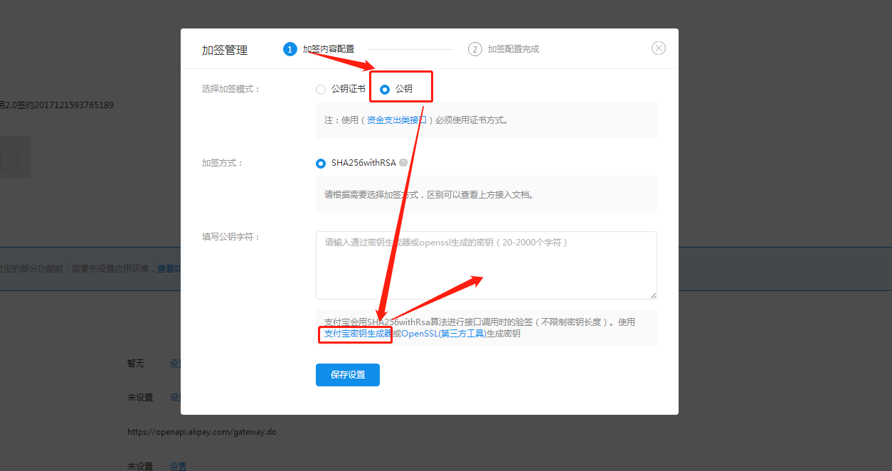 1.3.2、弹出窗口中,选择加签模式为“公钥”。若已有公钥,可直接填写在下方输入框内。若无,则点击“支付宝密钥生成器”。
