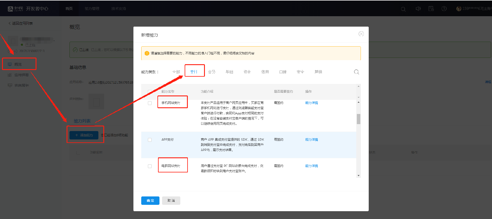 -如何签约“电脑网站支付”和“手机网站支付”:应用审核上线后,进入应用详情页,在功能列表处点击“概览”按钮,核对“电脑网站支付”和“手机网站支付”是否签约,如未签约,可勾选“电脑网站支付”和“手机网站支付”,点击“批量签约”,等待签约完毕即可。(如下图)