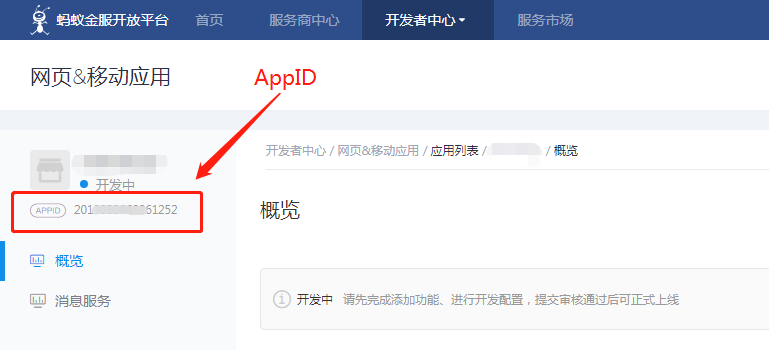 创建应用后会直接生成APPID,在页面左上方。