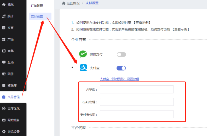完成以上步骤后,在建站支付设置中填写对应的APPID,RSA2密钥(即应用私钥),支付宝公钥即可。