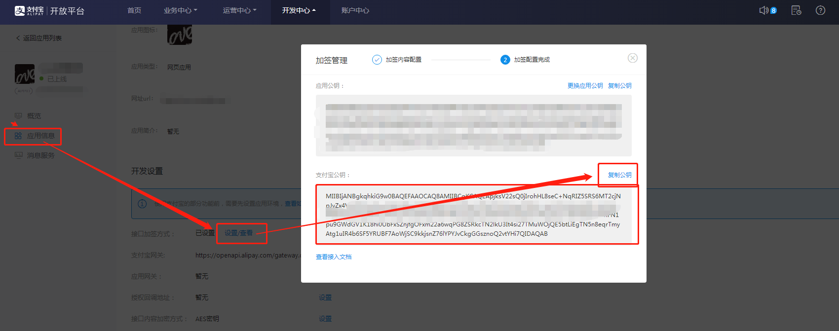 (appid、支付宝公钥“可在开发者中心—>我的应用—>应用信息”查看,RSA2密钥(应用私钥)你找不到的话回过头看“步骤1.3.3-1.3.5”)