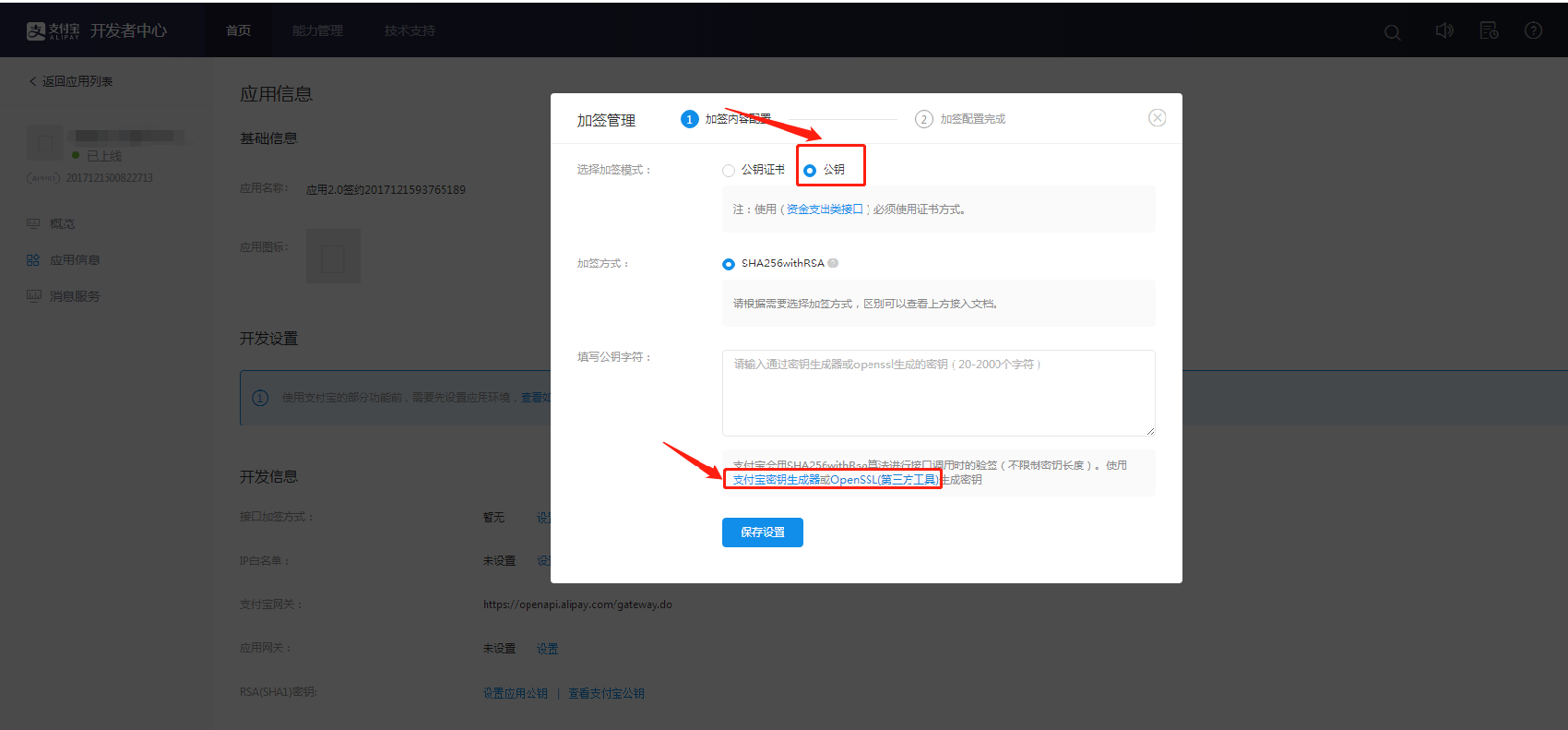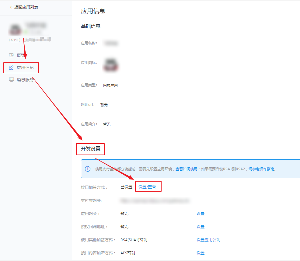 1.3.1、在“应用信息-开发设置-接口加签方式”处点击“设置”