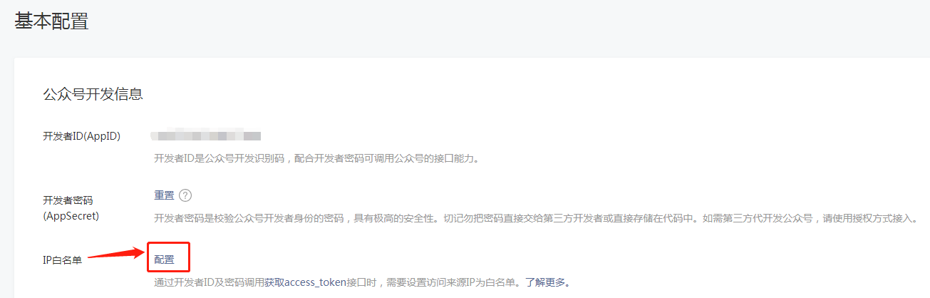 1.返回公众号后台,【开发-基本配置-IP白名单】,点击“配置”