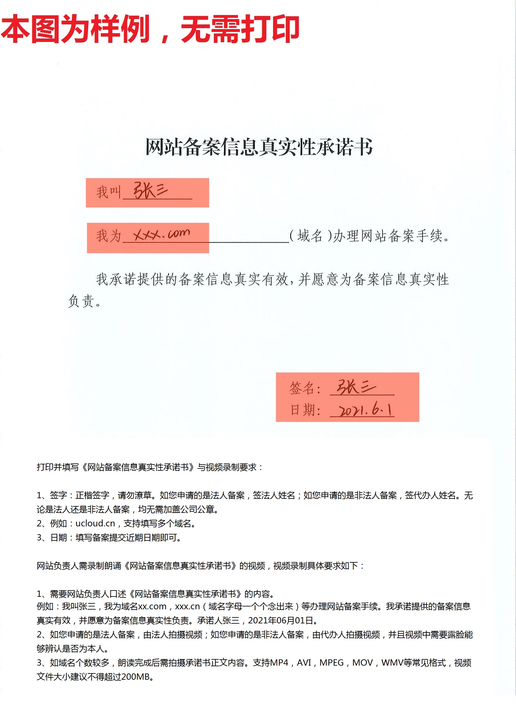 1. 《网站备案信息真实性承诺书》填写样例以及视频拍摄要求