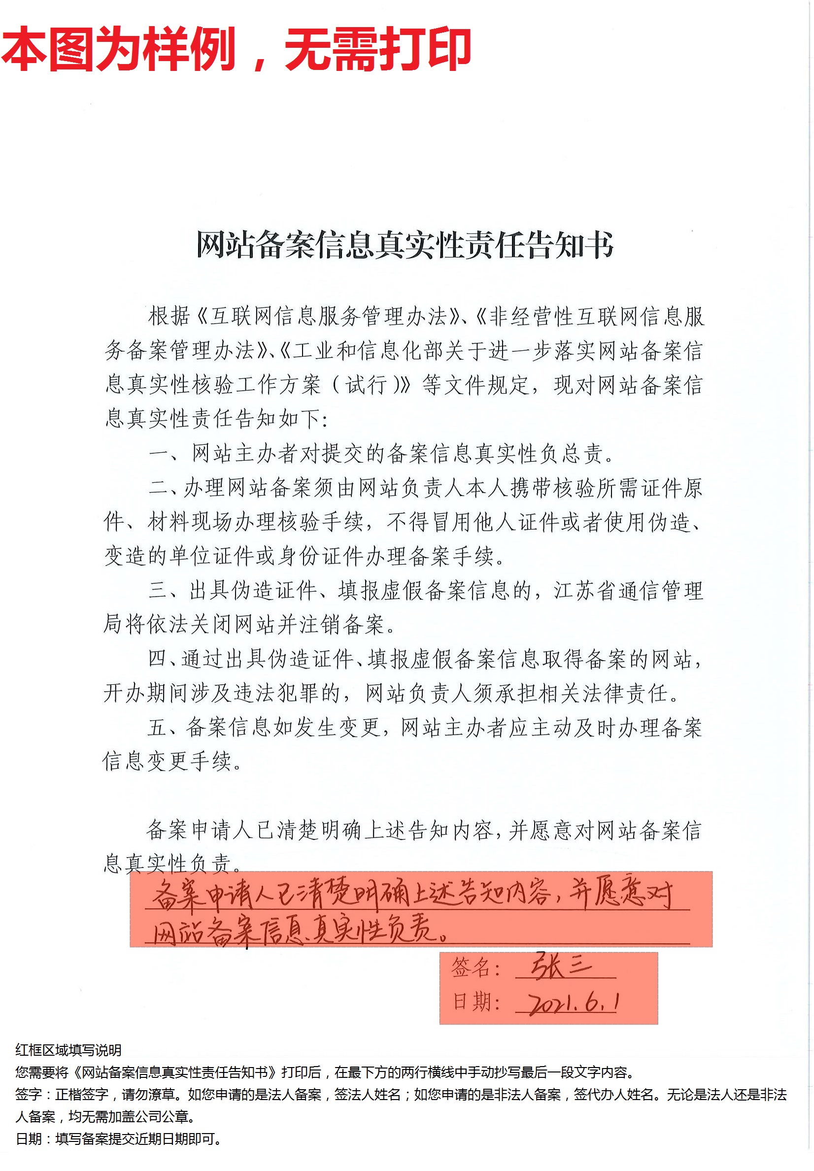 2. 《网站备案信息真实性责任告知书》填写样例
