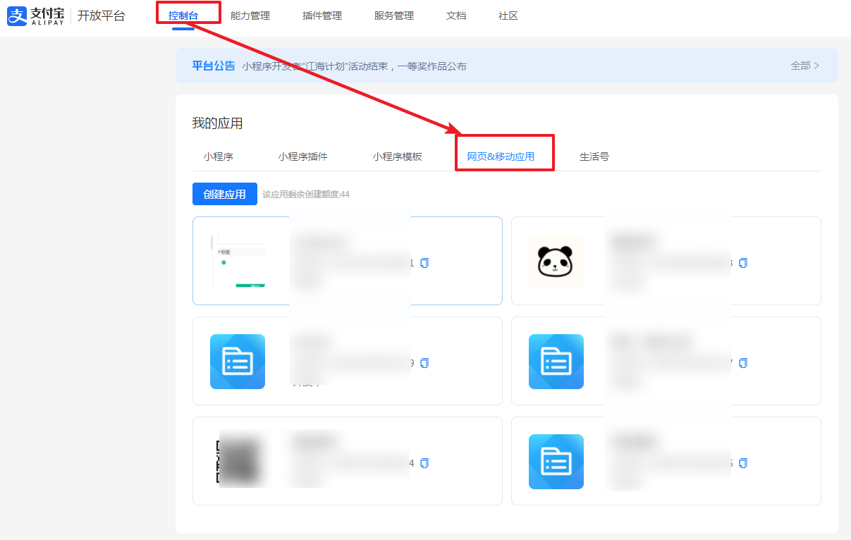 ② 在 [支付宝开放平台--控制台--网页&移动应用】中找到对应的应用点击进入设置页面。