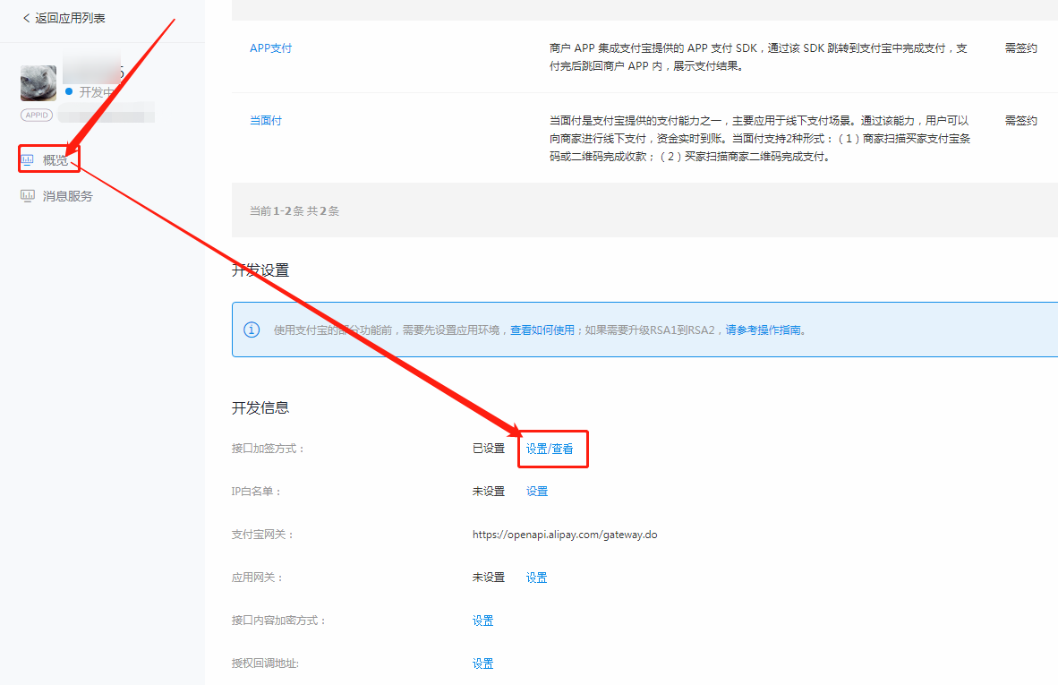 打开应用详情,在【概览-开发设置-接囗加签方式-设置/查看] 中,填写对应的公钥,完成后点击保存设置。