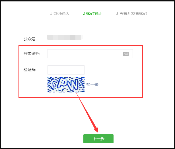 3. 输入公众号的登录密码和验证码后点击【下一步】。
