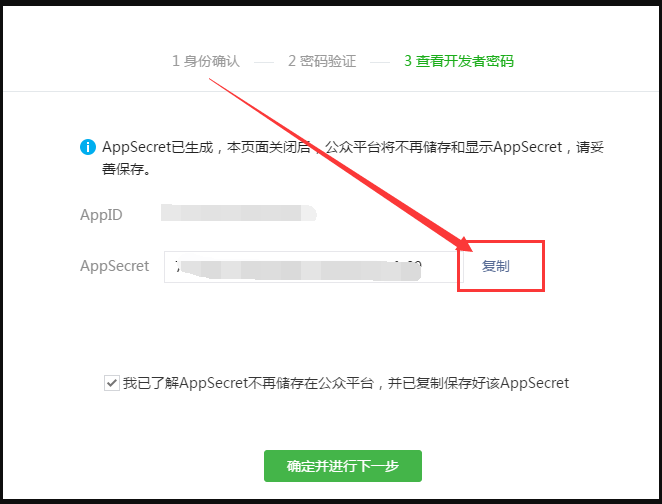 4. 复制已生成的AppSecret并填写到建站管理后台需要填写的位置。