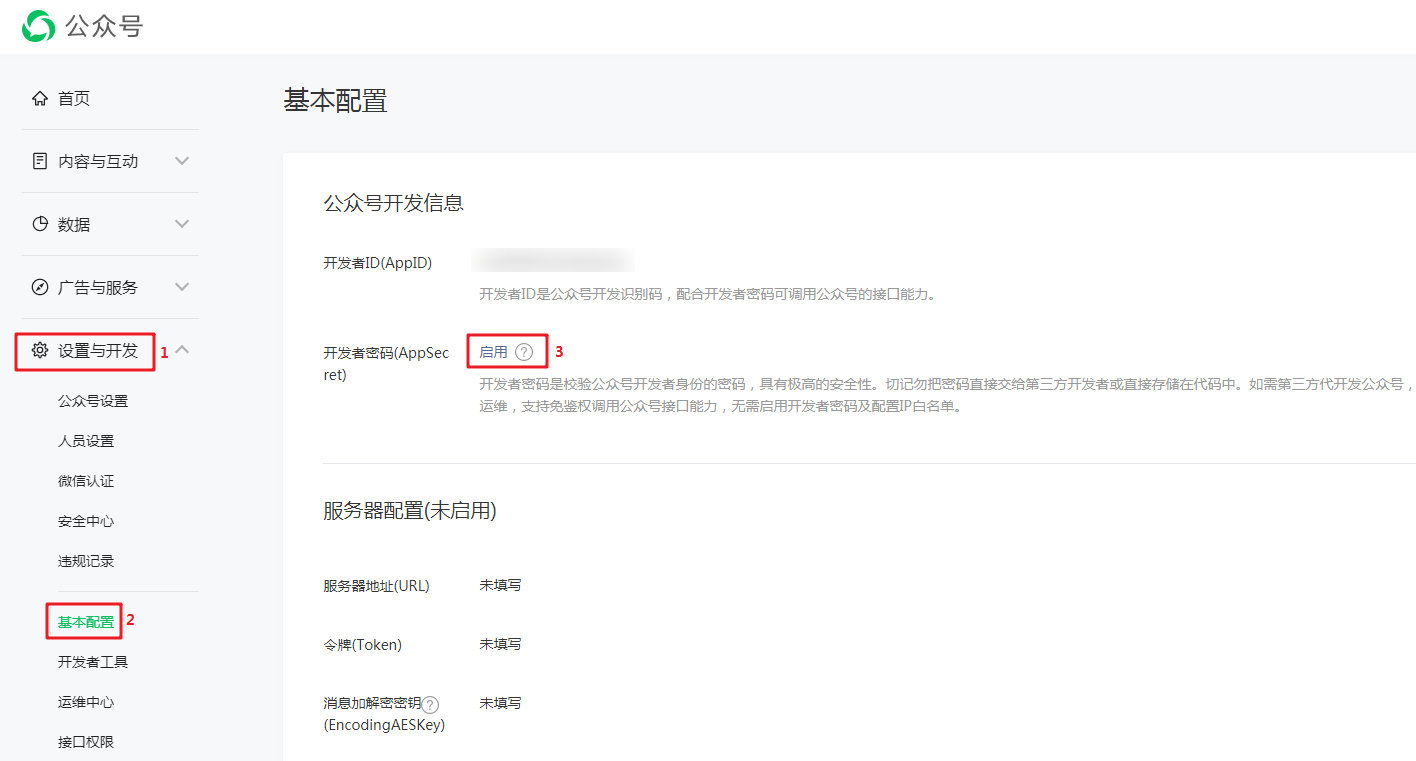 1. 登录微信公众号,进入到【设置与开发-基本配置】中点击【启用】开发者密码(AppSecret)。