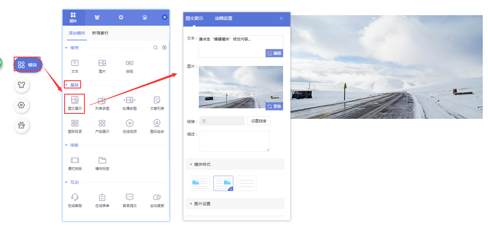 1.1 在网站设计页面点击页面左侧导航【模块-添加模块-基础】,添加【图文展示】模块。