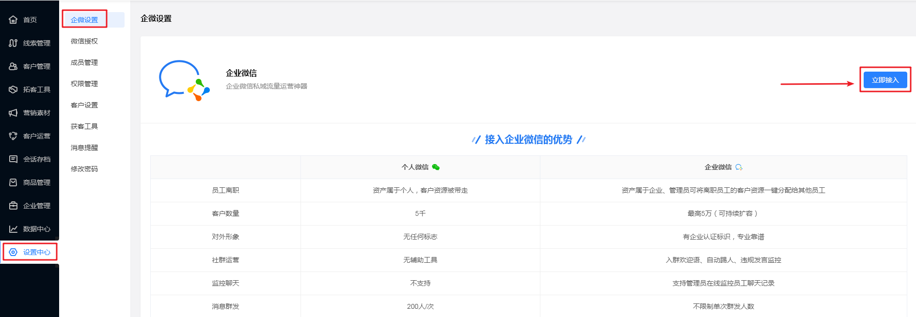 在销售系统管理后台【设置中心-企微设置】中点击【立即接入】。